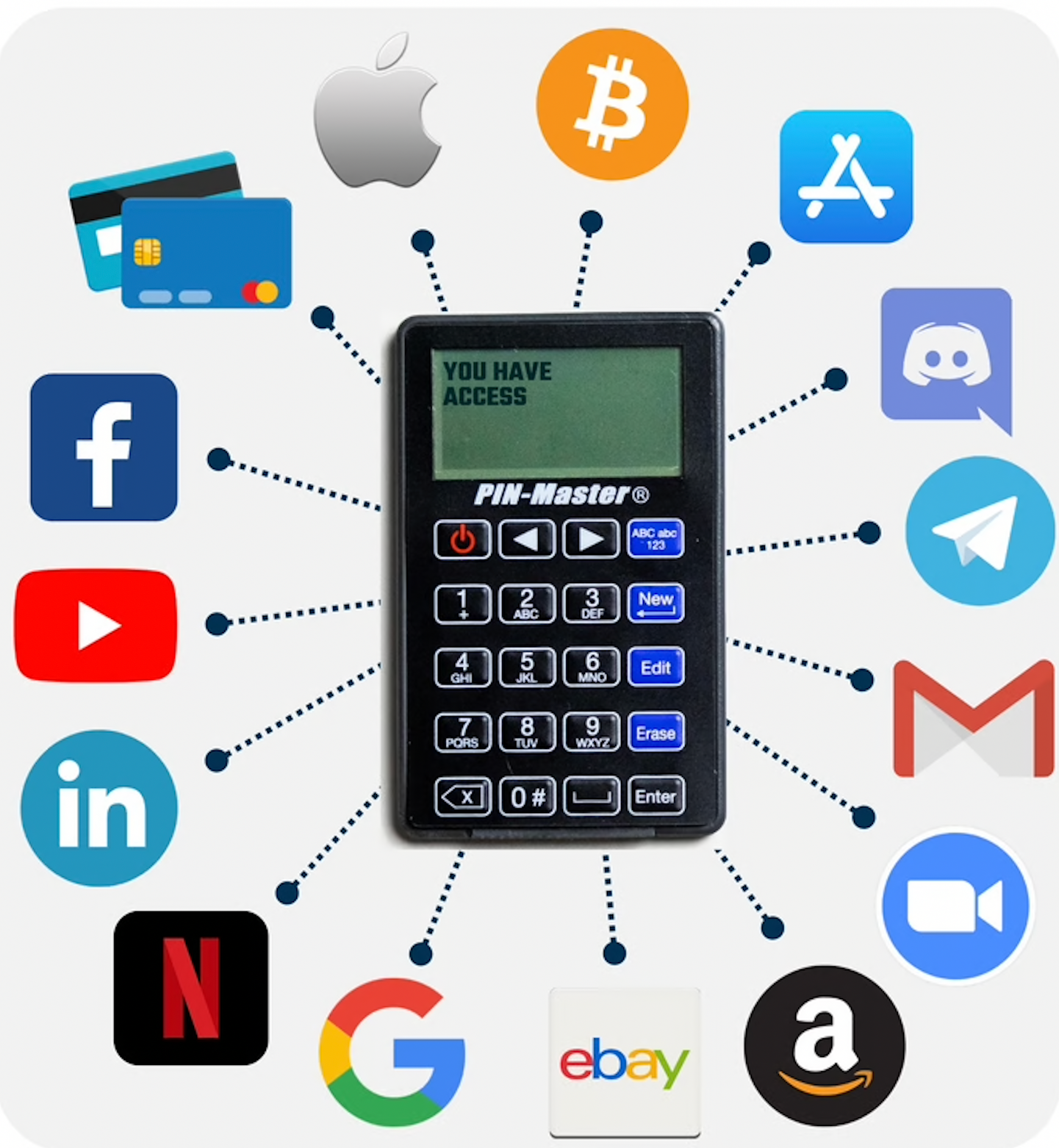 I modsætning til traditionelle metoder, der kan mistes, stjæles eller få adgang til af andre, tilbyder PIN-Master forbedret sikkerhed med kryptering og er designet til at holde dine oplysninger private og sikre.